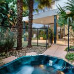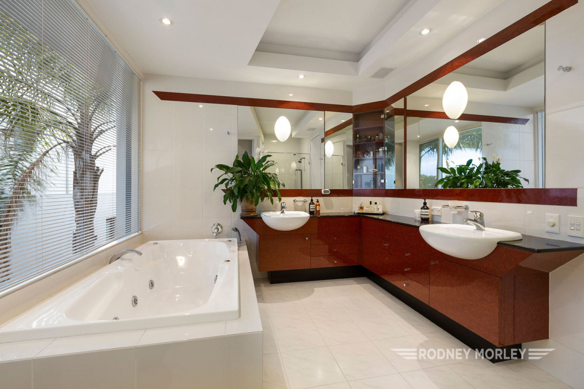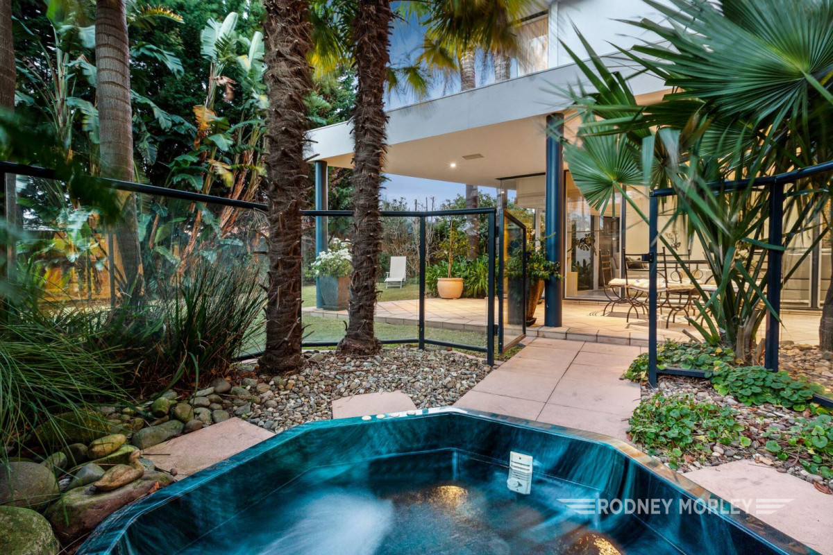 An elegant formal lounge and dining room with an angular spectacular wall of glass framing verdant views accompanies a casual family/meals zone and a huge rumpus room enhanced by a wonderful integration with a covered alfresco patio overlooking a landscaped tropical garden oasis and just in time for summer – an in-ground spa. The comprehensively equipped gourmet granite kitchen with St George appliances, two dishwashers and an abundance of solid timber cupboards will have you cooking up a feast in no time. Guests, extended family or teenagers will love the privacy of the downstairs’ bedroom, which enjoys direct access to a semi-ensuite bathroom.