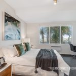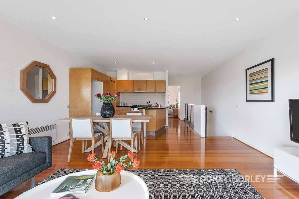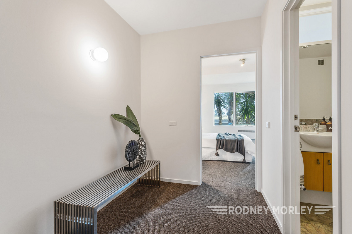 Architect designed in the 90s, this contemporary abode enjoys a wide entry with timber floors, a spacious bedroom (BIRs) opening onto an idyllic tropical courtyard garden with paved alfresco area; 2nd double bedroom (BIRs and desk) overlooking the Elwood Bridge and glorious beachfront parkland; a marble look bathroom and a separate laundry. Upstairs features a fabulous open plan entertaining area with solid timber floors and a sandstone balcony terrace taking in the magical bay views; funky granite kitchen (Bosch appliances), main bedroom (BIRs & desk) with private balcony and a marble-look semi ensuite.